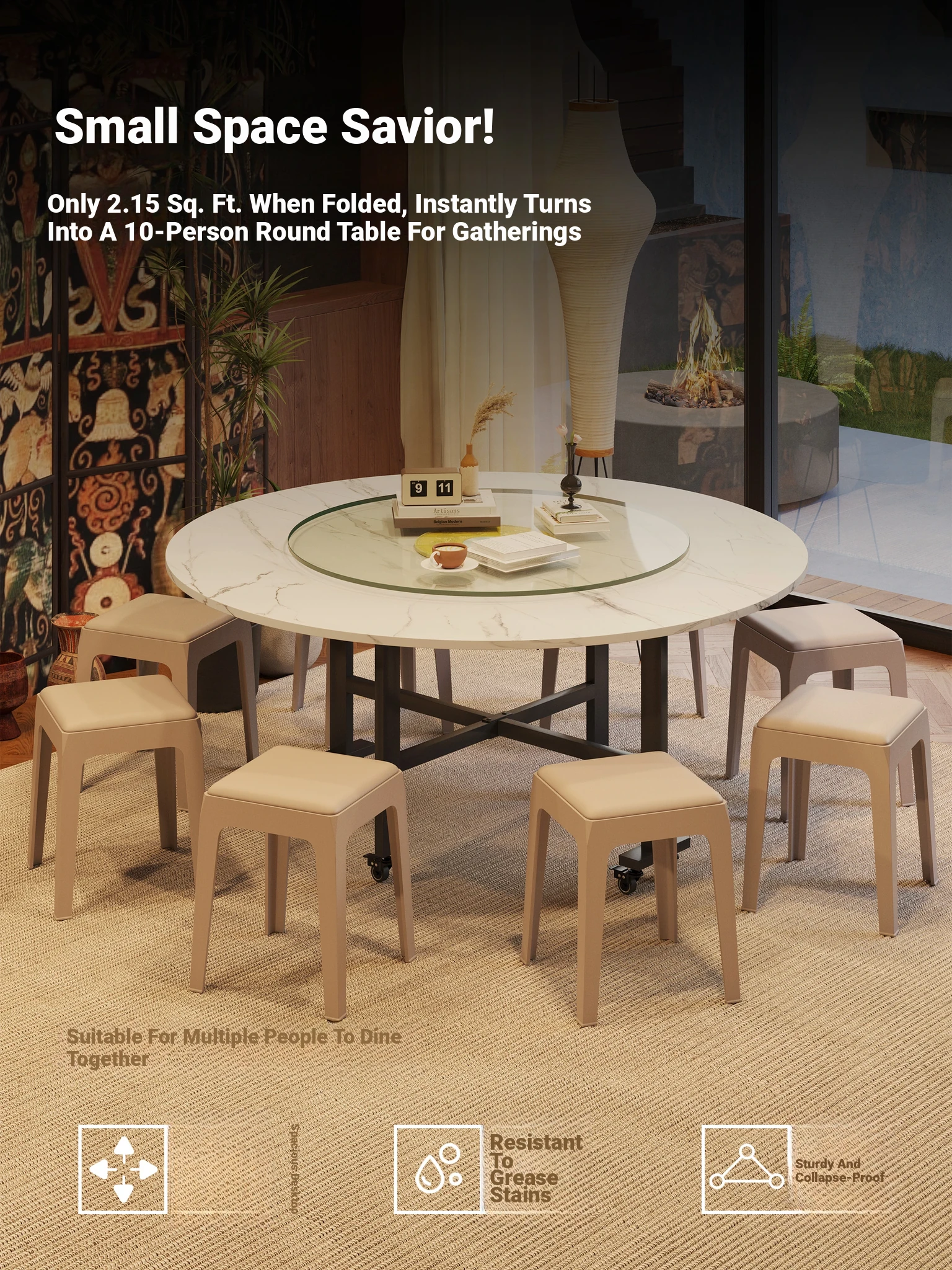 Foldable Round Dining Table for Small Apartments - Accommodates Up to 10 People, Portable Design with Rotating Centerpiece, Perfect for Family Gatherings and Renters
