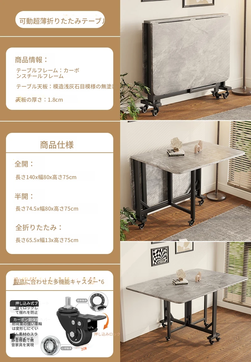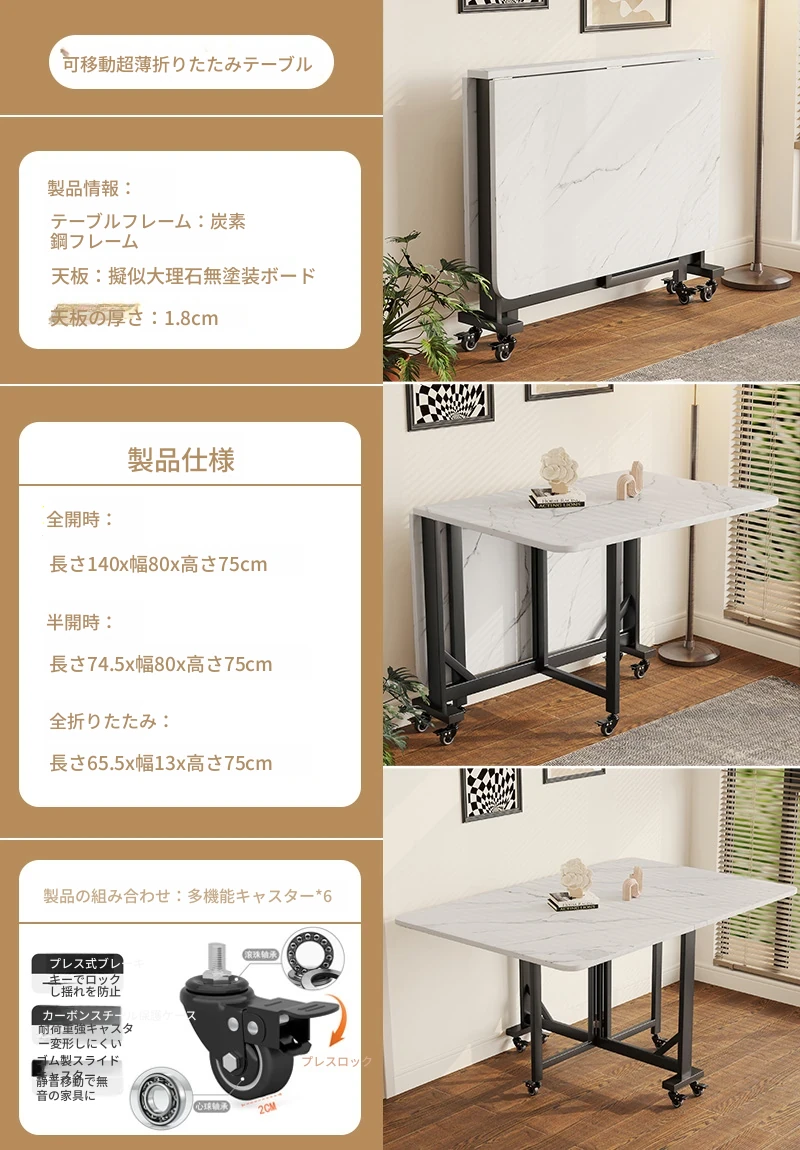 【アップグレードキャスター款】80*140ホワイト大理石模様 移動簡単/固定